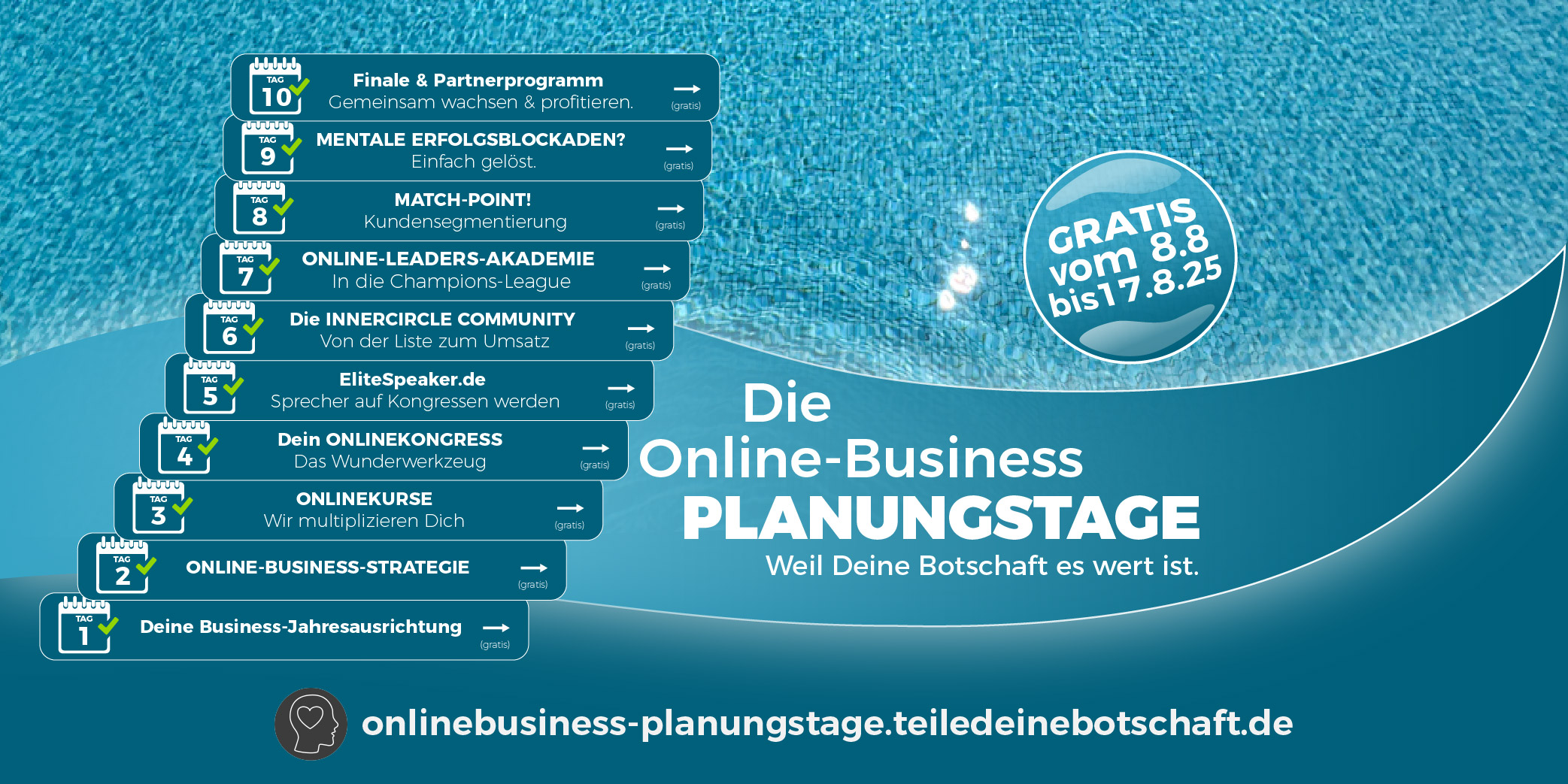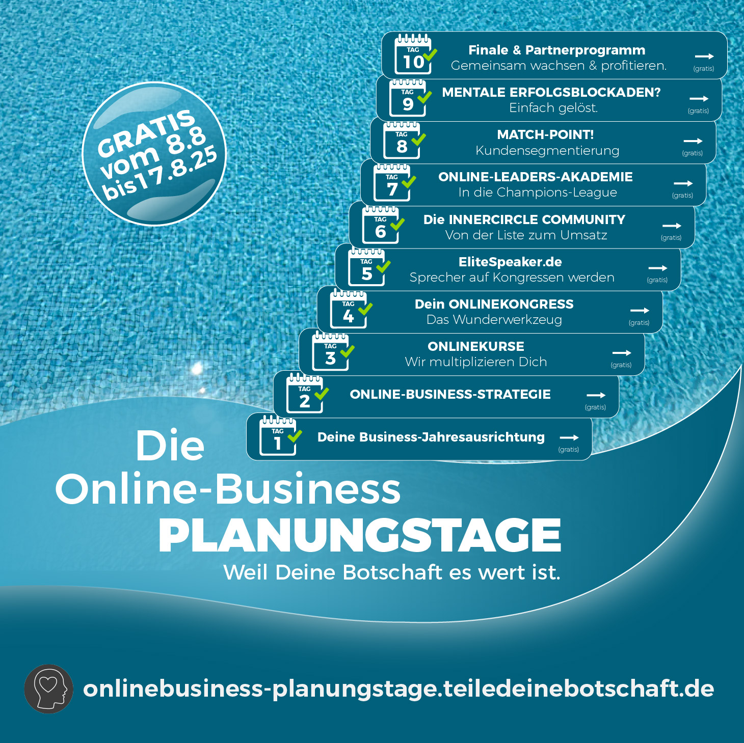 vom 8. bis 17. August laufen unsere 10-tägigen Onlinebusiness-Planungstage. Kostenlos. Live. Aufzeichnung inklusive.